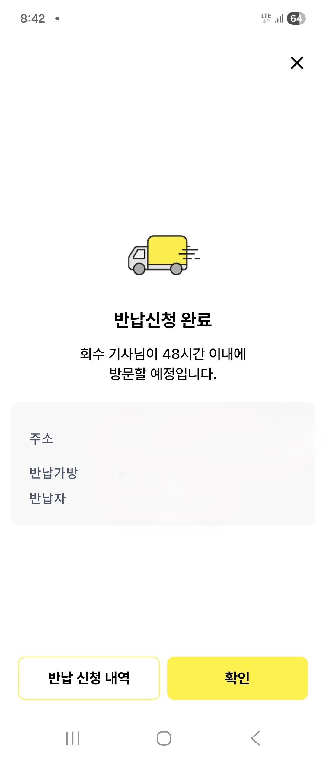 그러면 '반납신청 완료'가 뜹니다