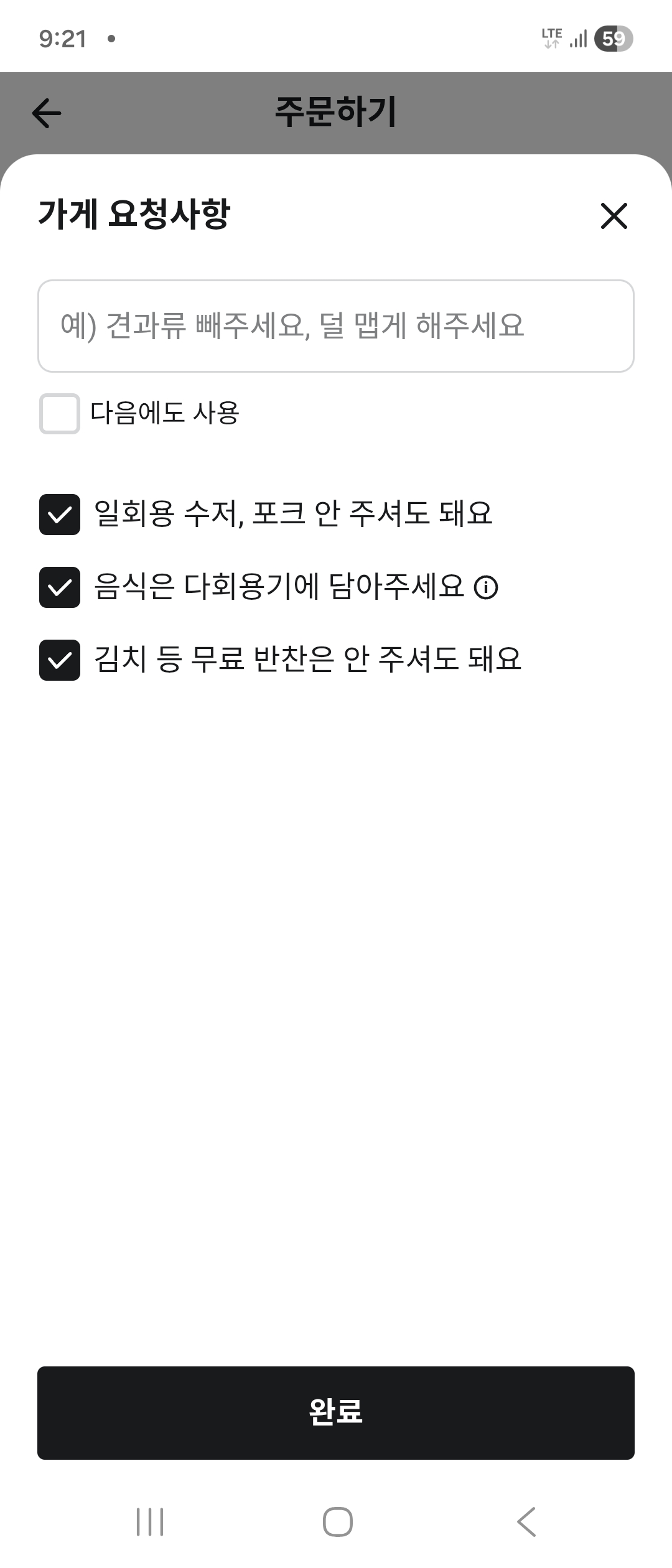 8. 다회용기에 담아달라는 곳에 체크해 주세요.