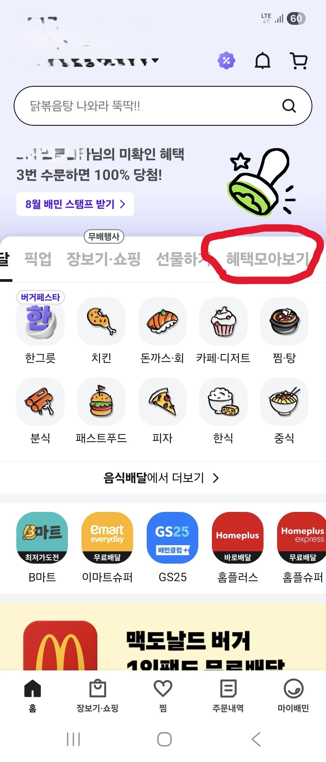 1. 배달의민족 어플을 실행합니다.