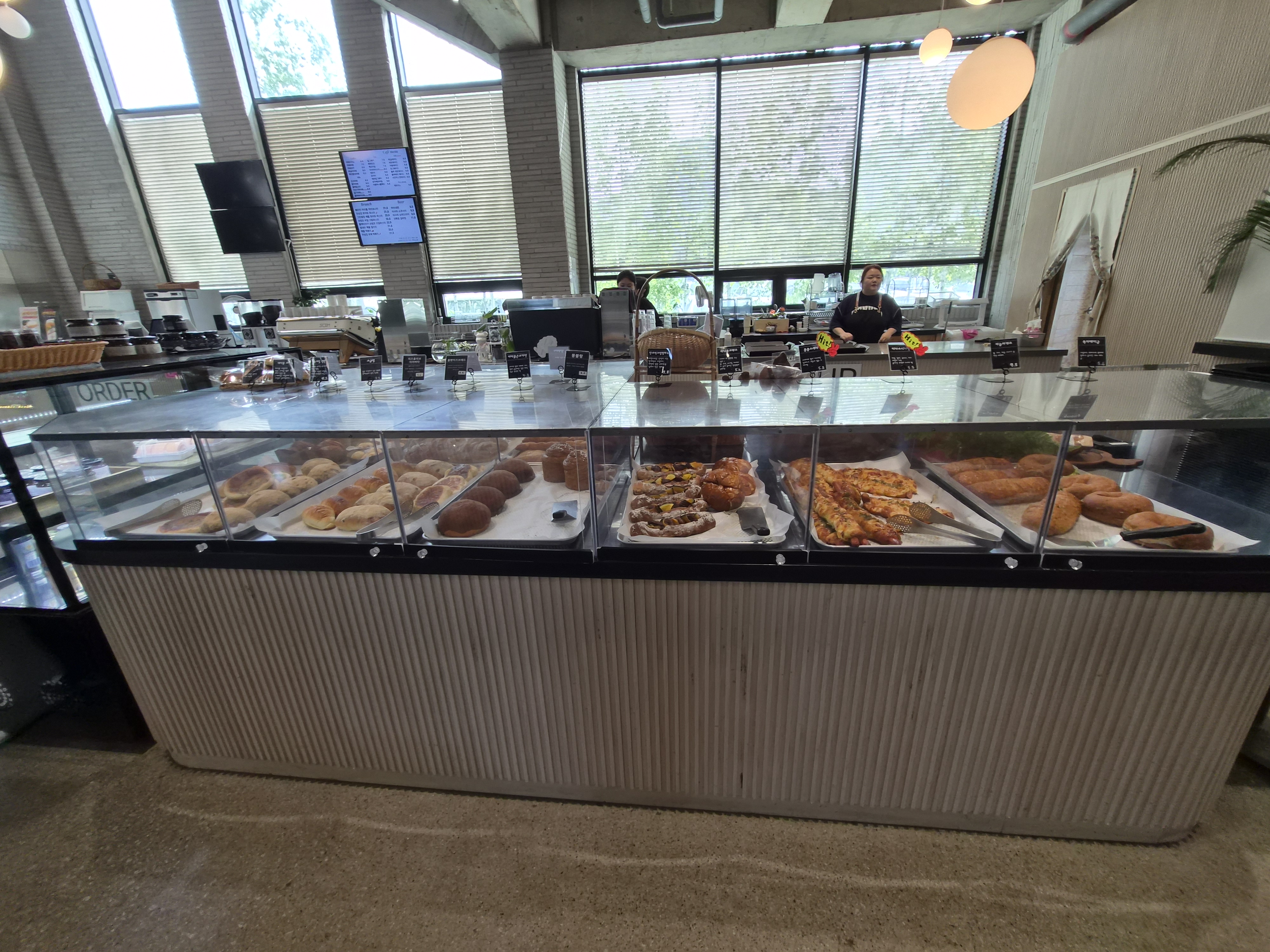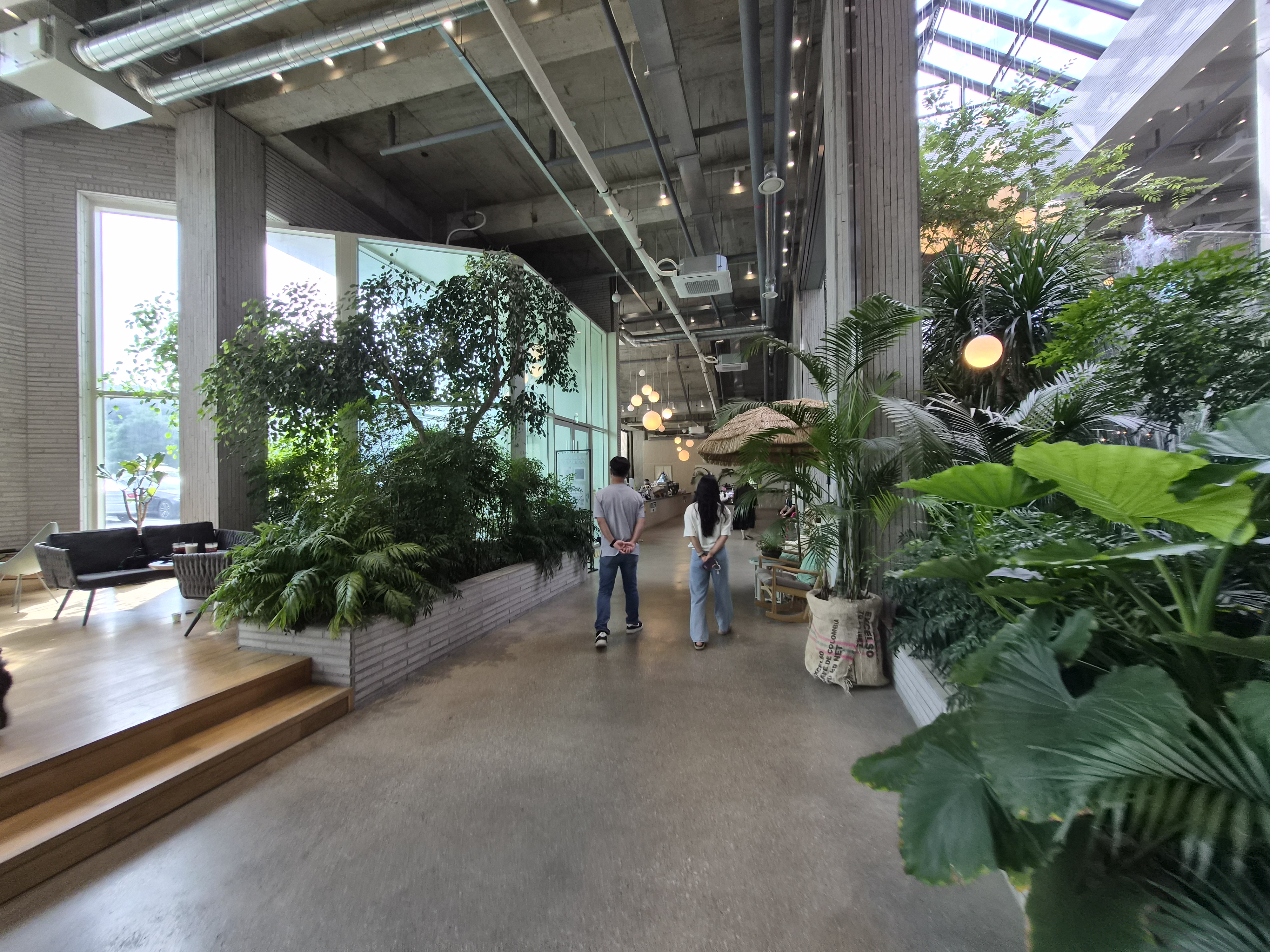 시내와는 떨어진 외진 곳이지만 손님이 많았는데요. 카페 앞에 다다르자마자 넓은 주차장과 천연잔디 운동장이 눈에 띄었어요. 그리고 3층 카페 건물에 들어갔더니 마치 식물원에 온 것 같은 기분이 들었어요. 건물 전체에 실내 정원이 있었거든요. 몹시 상쾌한 기분이 들었는데 저의 강아지들도 저와 같았는지 표정이 참 밝았습니다.
