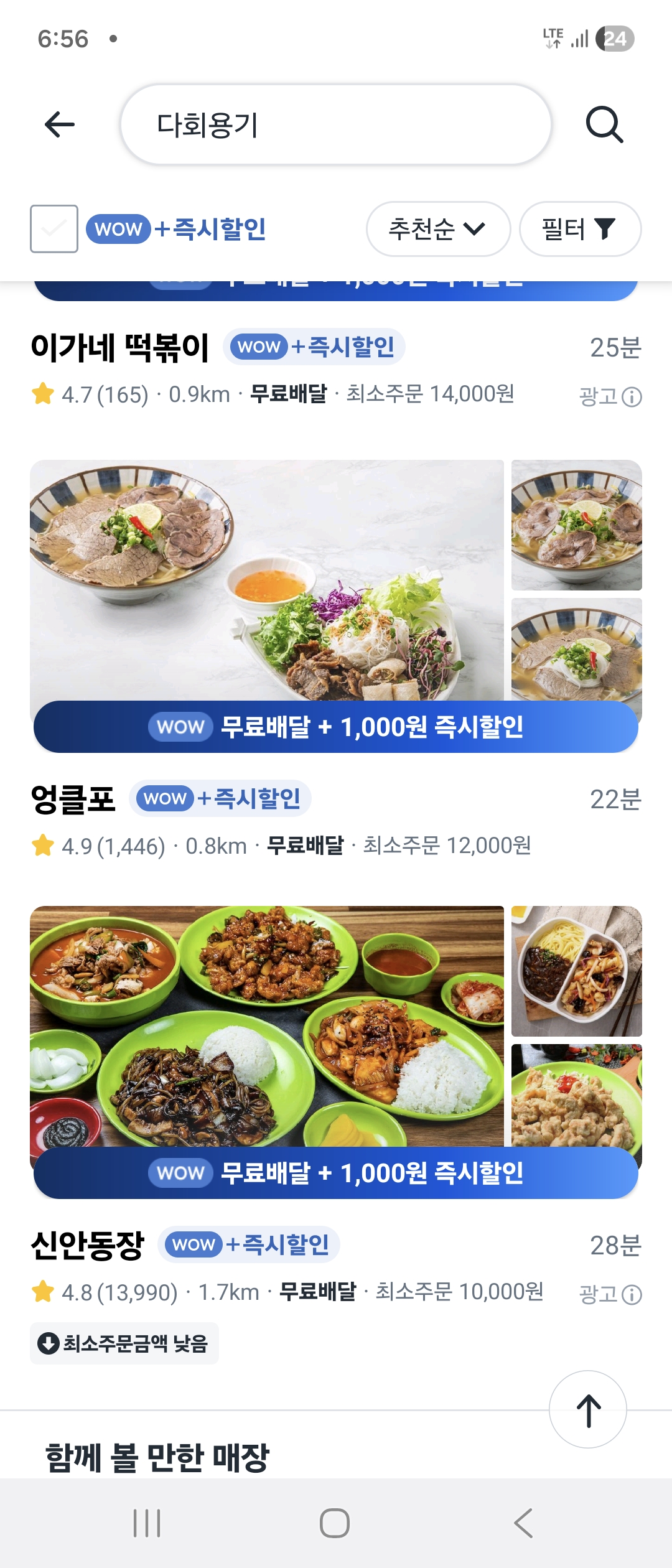 1. 쿠팡이츠 어플을 열어서 검색창에 '다회용기'를 입력하고 검색해요.