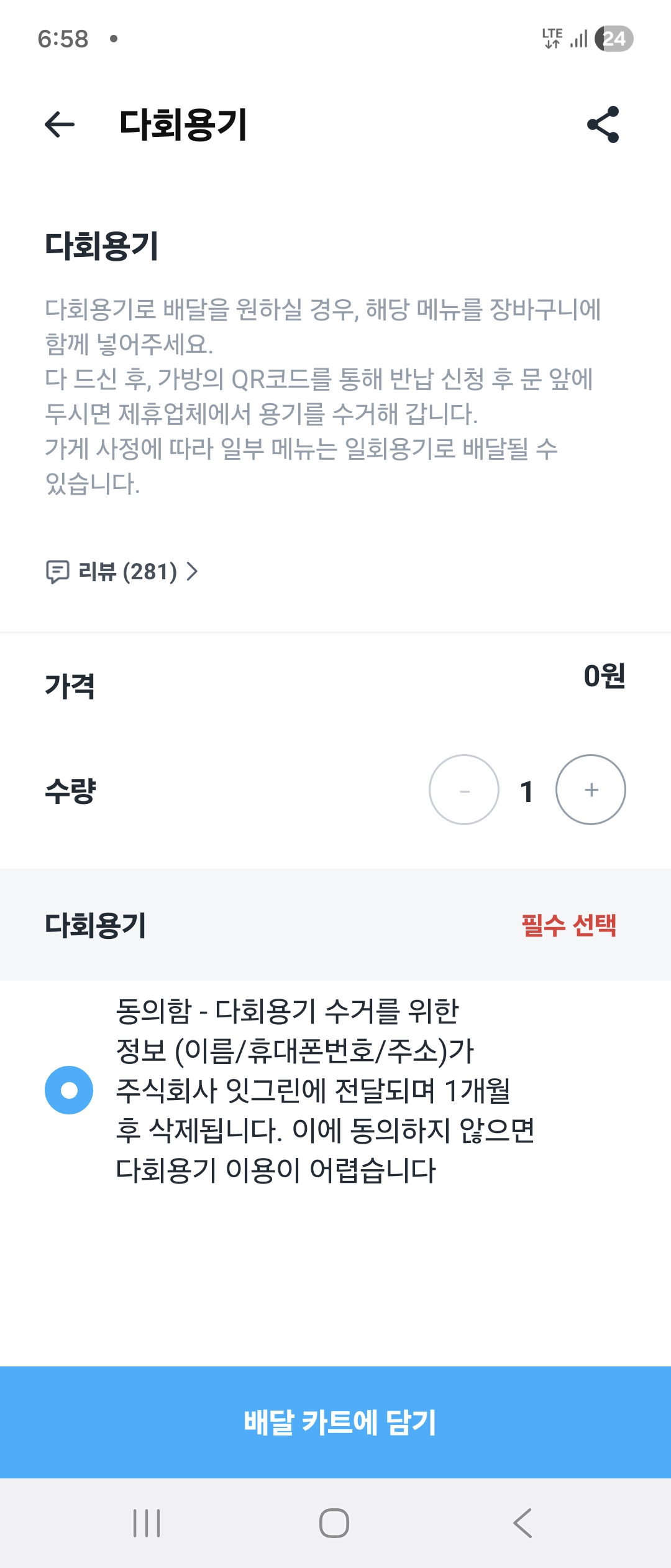 4. 다회용기 배달 및 수거를 위한 정보제공에 동의를 누릅니다.