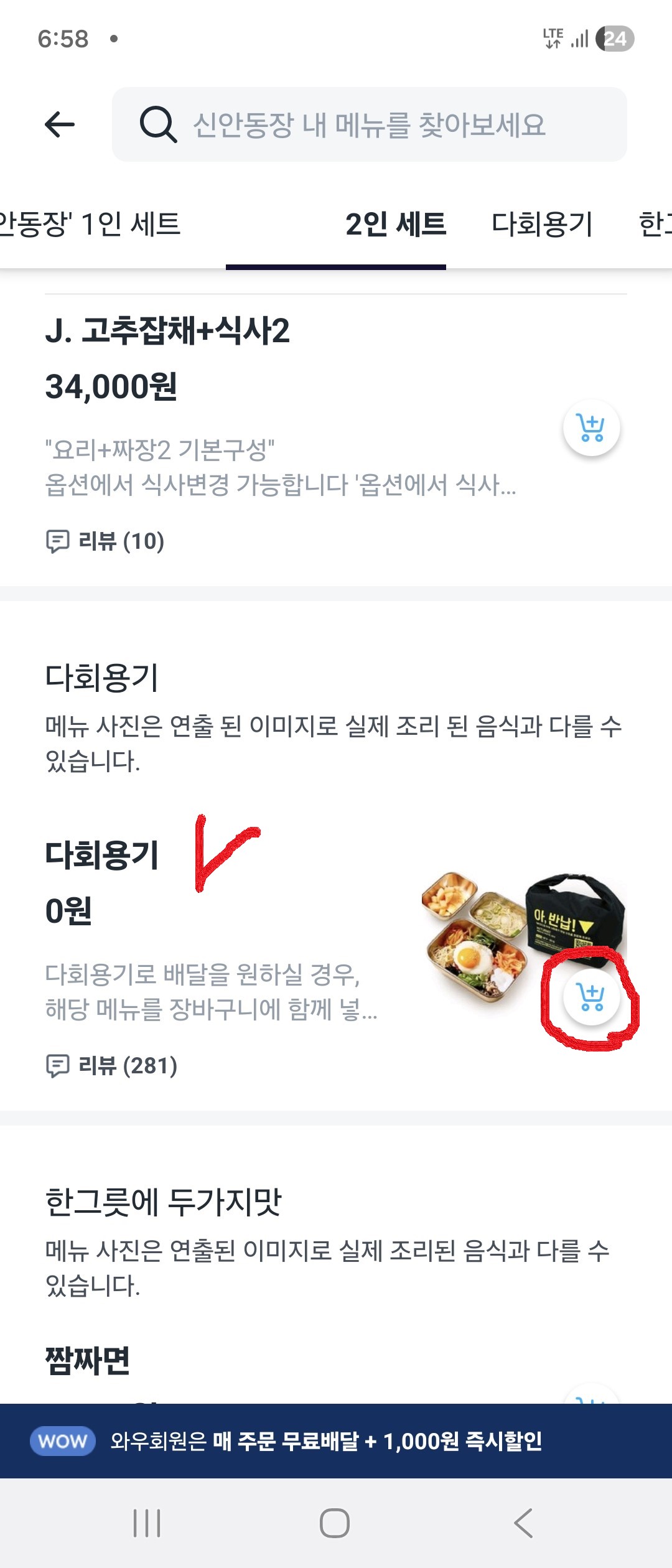 3. 원하는 메뉴와 수량을 누르고 다회용기의 장바구니를 클릭해요.